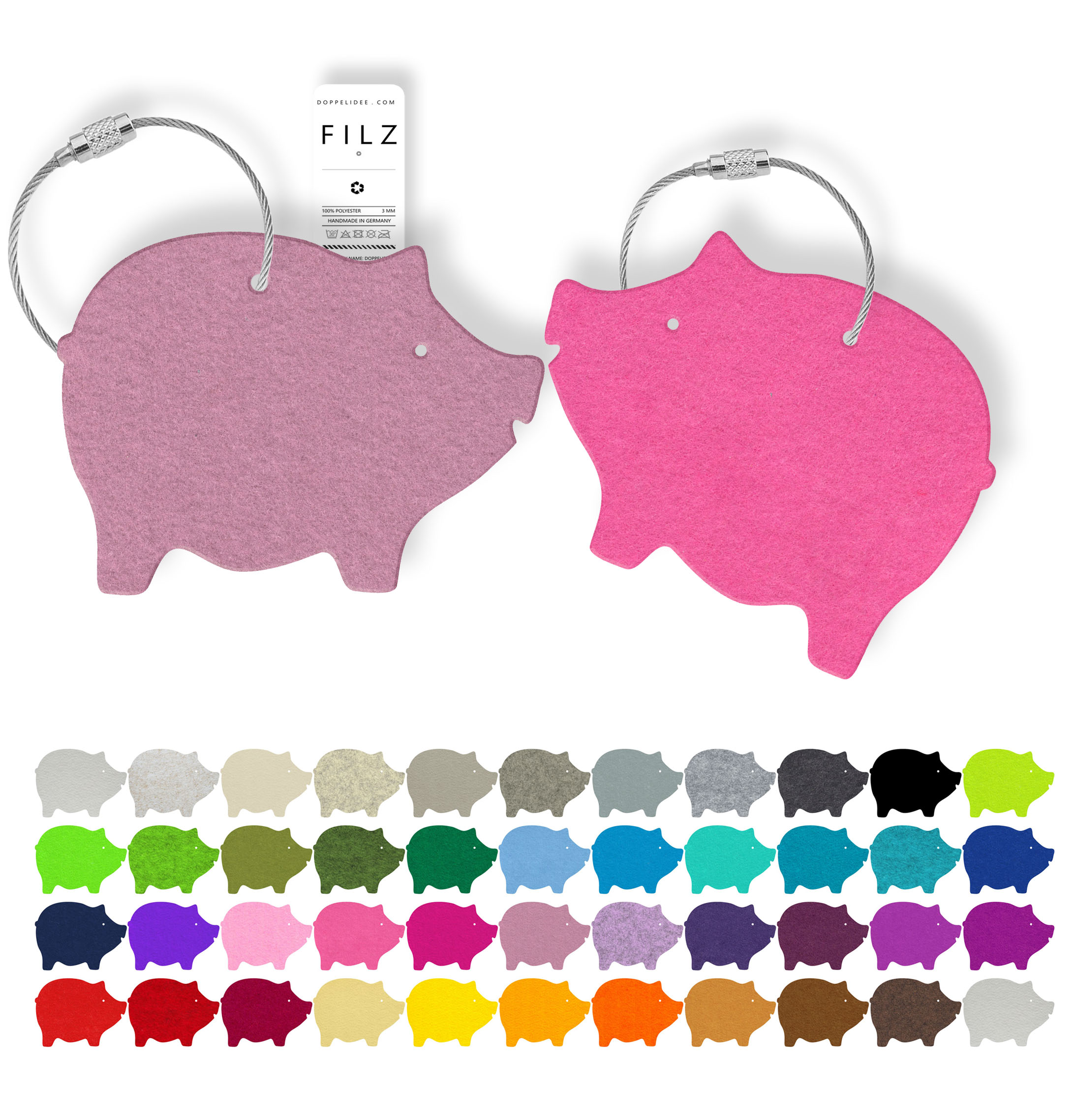 Ein niedlicher Schwein Schlüsselanhänger aus 3mm Polyesterfilz, der als Glücksbringer für Schlüssel oder Taschen dient. Dieser leichte und bis 30 Grad waschbare Anhänger hat eine Größe von ca. 6 cm. Der Schlüsselring aus Edelstahl-Seil mit Schraubverschluss sorgt für sicheren Halt. Mit über 40 Farben zur Auswahl bietet dieser Glücksschwein Anhänger vielfältige Gestaltungsmöglichkeiten.