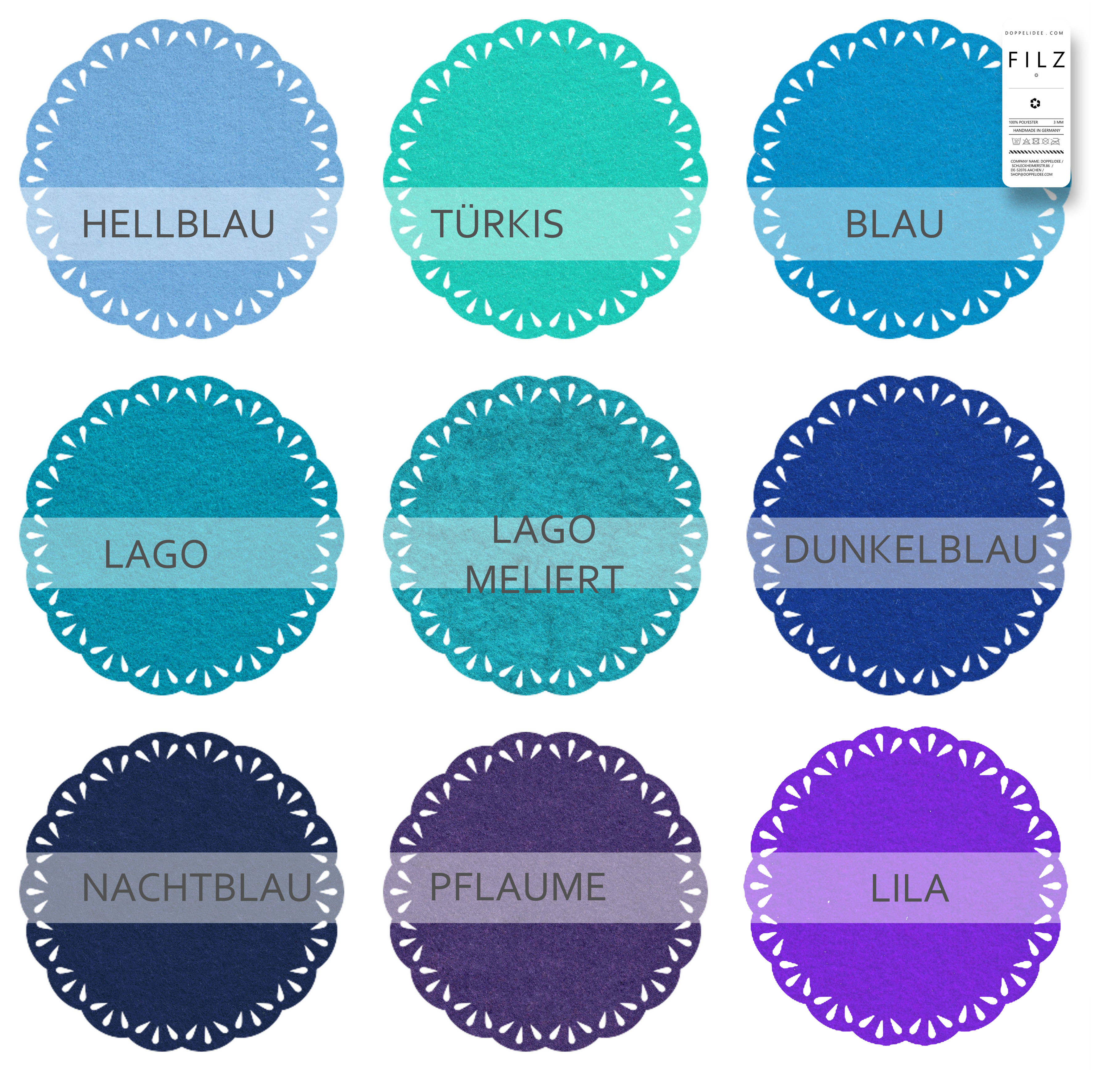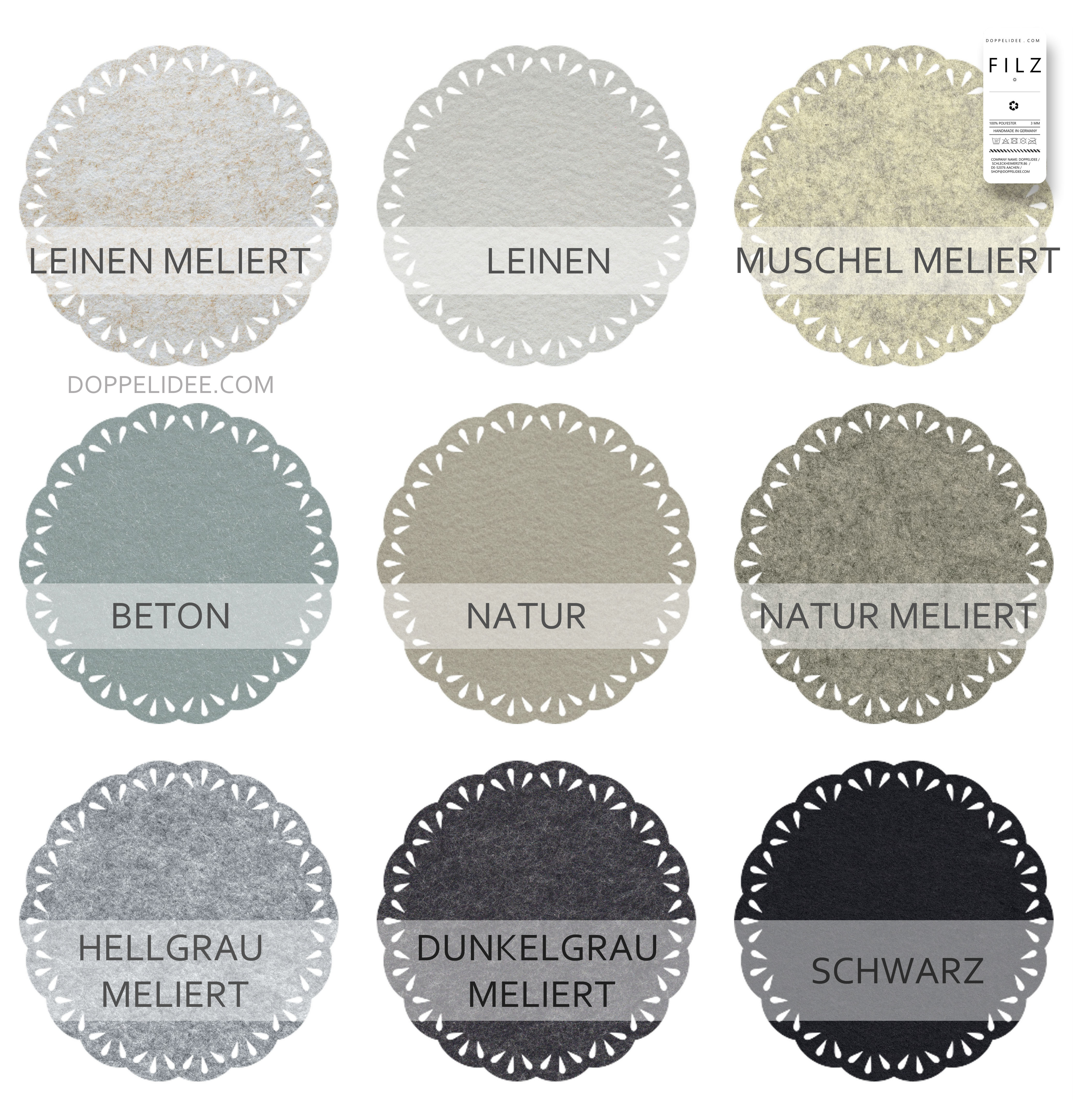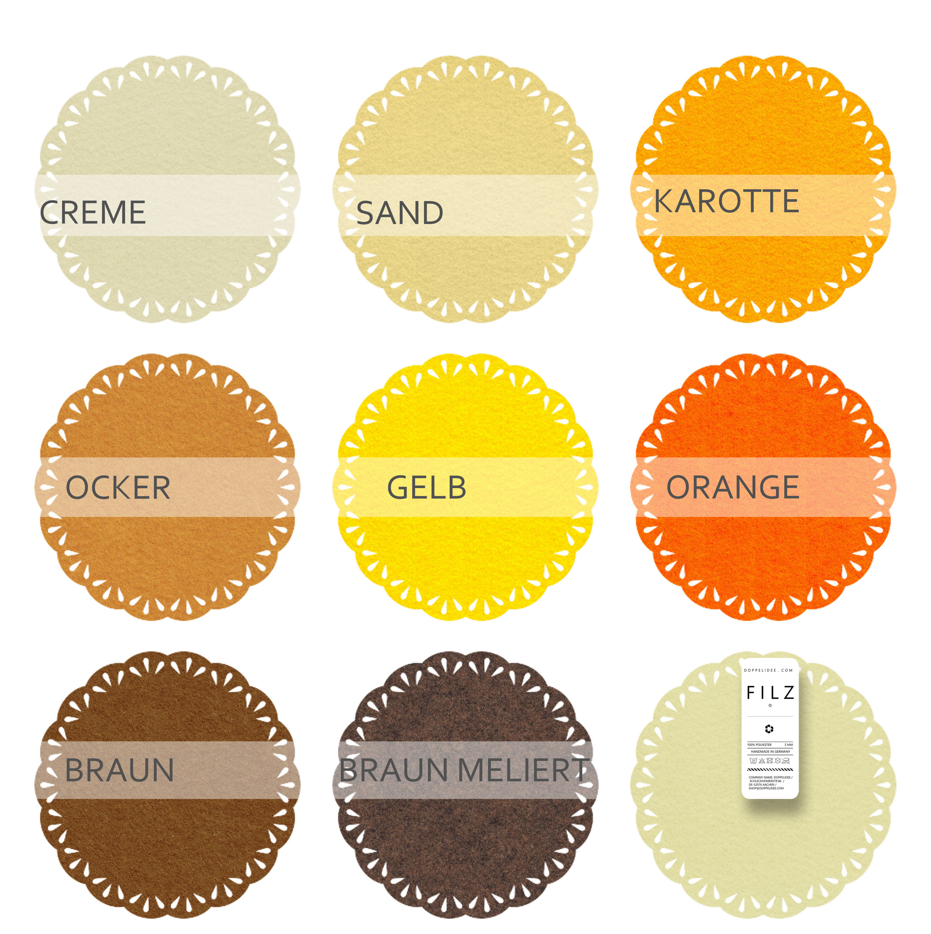 Jeder Untersetzer ist kunstvoll gestaltet und strahlt eine zeitlose Schönheit aus. Ob als Dekoration auf dem Tisch, als Untersetzer für Ihre Getränke oder als Platzmatte für Ihren Esstisch - unsere Filzuntersetzer mit Spitzenrand sind vielseitig einsetzbar und verleihen Ihrem Zuhause eine elegante Note.